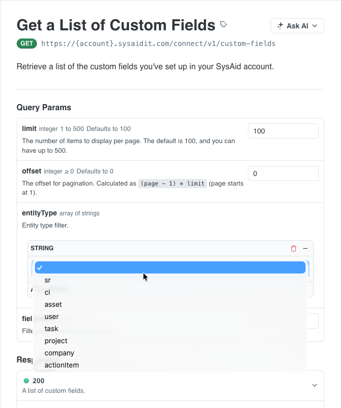 entityType | The type of entity you want to view the custom fields for. The entities include: - Service record - CI - Asset - User - Task - Project - Company - Action item |